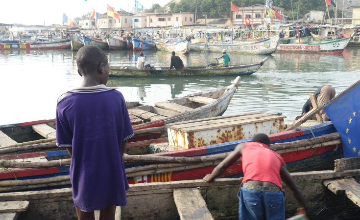 Ignoring our focus on the lad, Nana continued, "they fish octopuses, squids, lobsters, cassava fishes and the rest..." He said boats like the approaching one are semi-industrial vessels that trawl the ocean floor, but that there were also larger non-African ones further out at sea.
