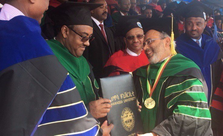 The honorary doctorate was conferred by Ethiopia's Deputy Prime Minister, Ato Demeke Mekonene in recognition of Lopes' leadership and intellectual contribution to Africa's development on the Continent and beyond. Present at the ceremony was Arkebe Oqubay, Minister and Special Advisor to Ethiopia's Prime Minister, Haile Mariam Desalegn and Ambassador Mohamed Idriss Farah of Djibouti.