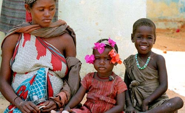 A Somali mother and two children waiting for food at a feeding centre in Mogadishu.