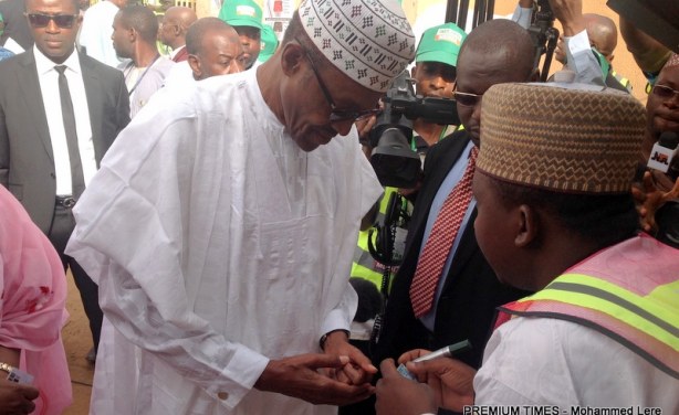 Muhammadu Buhari, presidential candidate of the All Progressives Congress, APC being accredited at his polling unit.