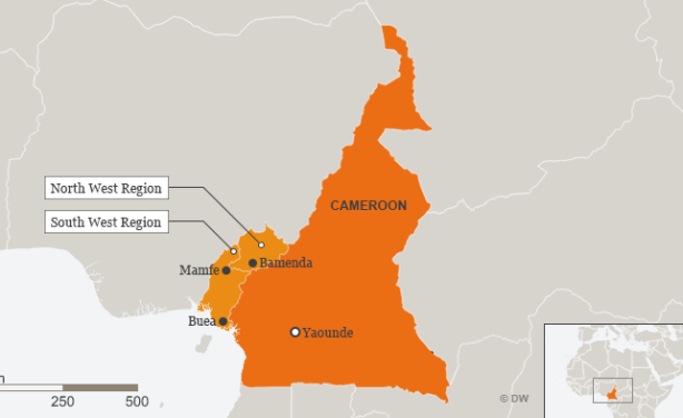 Map of Cameroon showing north-west and south-west regions.